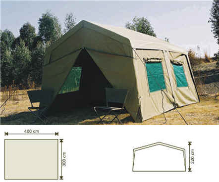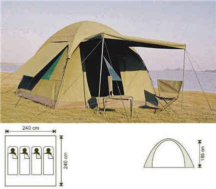 Capaciteit: 4 personen; Gewicht: ;Buitentent: 65% polyester en 35% katoen; Binnentent 65% polyester en 35% katoen; Vloer PVC/Polyester met fibreglas stokken