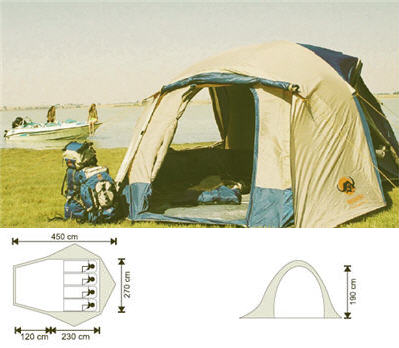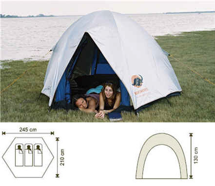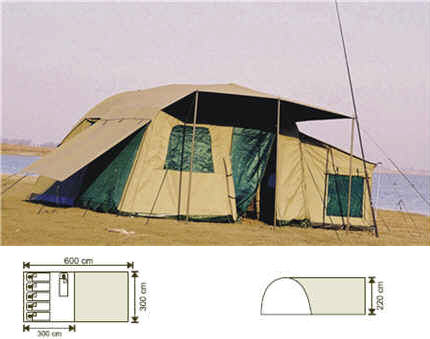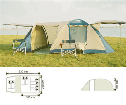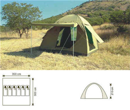 Capaciteit: 6 personen; Gewicht: ;Buitentent: 65% polyester en 35% katoen; Binnentent 65% polyester en 35% katoen; Vloer PVC/Polyester met fibreglas stokken