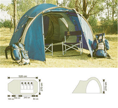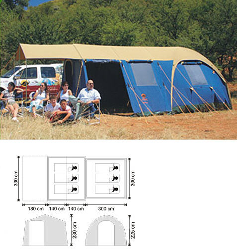 Capaciteit: 8 persoons; Gewicht 25 kg; Afmeting (lxbxh):(130+200+130)x510x210; Buitentent: Polyester pu coated 2000mm; Binnentent:Ademend Polyester; Vloer: Pe sheet; Frame: F/G en stalen stokken; Slaap gedeelte is door afscheidingen in 3 vertrekken te ver