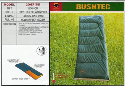 Size: 200x85; Shell: Polyester ripstop 190T W/R W/P cire; Lining: COTTON 30x30 68x68; Filling: Hollow fiber 200G/SM; Specification: basic model of rectangular sleeping bag to start, 100% natural and good quality cotton for lining to sleep in comfortably,