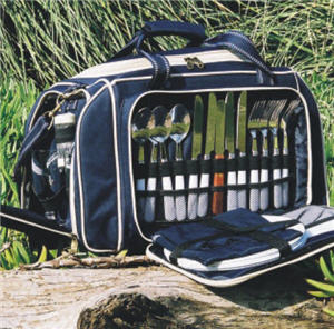 Size: 51x23x29cm; Weight: 9kg; Material: 600D/Silver PVC; 4 glazen; 4 rvs messen, vorken en lepels; 4 x Melamine plates with blue trim; 4 x blue napkins; 1 x deluxe chees knife; 1 x cutting board; 1 x 2-in-1 salt/pepper shaker; 1 x corkscrew; 1 x tableclo